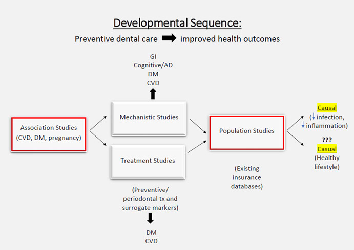 Tracing the development of a discipline referred to as “Periodontal Medicine”, the first studies identified cross-sectional associations between periodontal disease and several chronic diseases, most notably cardiovascular/cerebrovascular disease and diabetes mellitus, as well as adverse pregnancy outcomes. These reports, which were confirmed by investigators across the U.S. as well as globally, were followed by two lines of investigation:1) treatment studies to determine if conservative treatment could improve health outcomes, and 2) mechanistic studies, generally using animal models, to define mechanisms to explain how oral infection/oral inflammation could contribute to certain chronic diseases (see Figure 2).