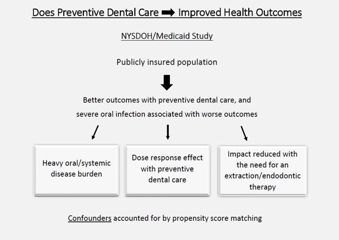 To answer some of the open questions, a recent report examined a publicly insured population from New York State, evaluating the relationship of preventive dental care to health outcomes, including emergency department visits and hospitalizations, as well as costs associated with utilization of these services, plus both pharmacy and total health care costs.30Lamster IB, et al. Dental services and health outcomes in the New York State Medicaid Program. J Dent Res. 2021:220345211007448 https://www.ncbi.nlm.nih.gov/pubmed/33880960. Here the comparison was between enrollees in the NYS Medicaid program who did, and did not, access dental services. This database was important to study because the NYS Medicaid program provides the most robust adult dental benefits of any state. A total of 518,689 members, ages 42 to 64 years of age at the conclusion of the study, who were continuously enrolled for 3 years, were evaluated. Dental services in years 1 and 2 were compared to health outcomes in year 3. Consideration of potentially confounding factors included adjustment for 15 variables (examples include a well-person medical visit and categorized health status). Accounting for these confounding variables will strengthen the association of the two variables of interest, that is utilization of dental services and health outcomes (Figure 3).