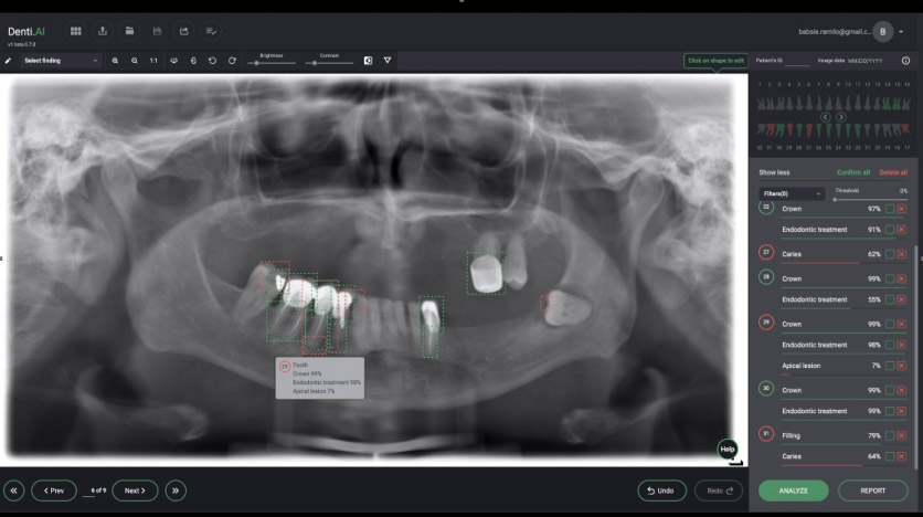 Figure 3. Panoramic radiograph analyzed by an AI system identifies deviations from normal. In this system deviations are listed by tooth number to the right. The percentages reflect the probability of that finding being present. Image courtesy of Dr. Eric Pulver (Denti.ai).