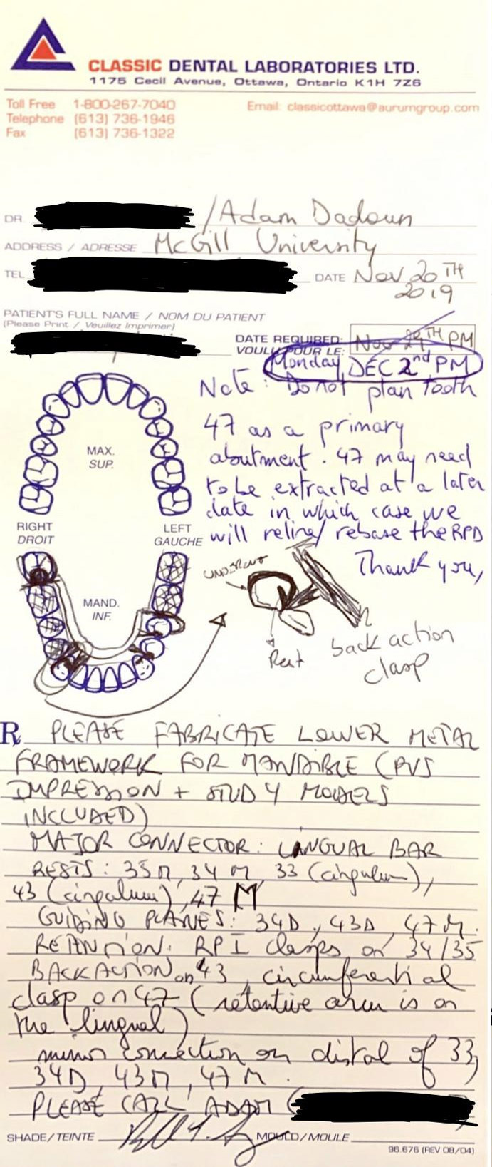 • 47 (US # 31) has a questionable prognosis due to high restored tooth and 2 additional class 5 caries mesio-distally. We decided to design the partial denture so that we could add a denture tooth if the patient