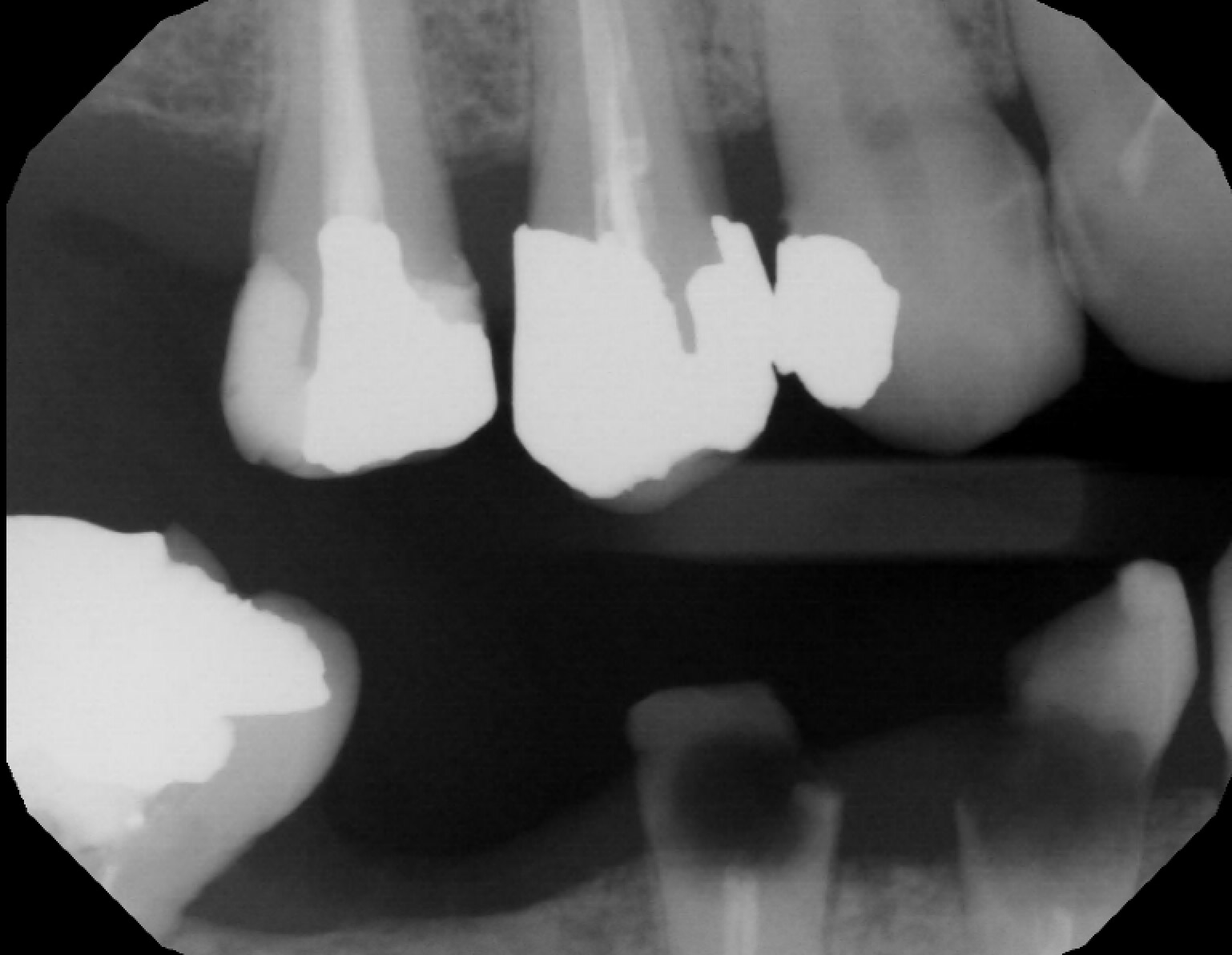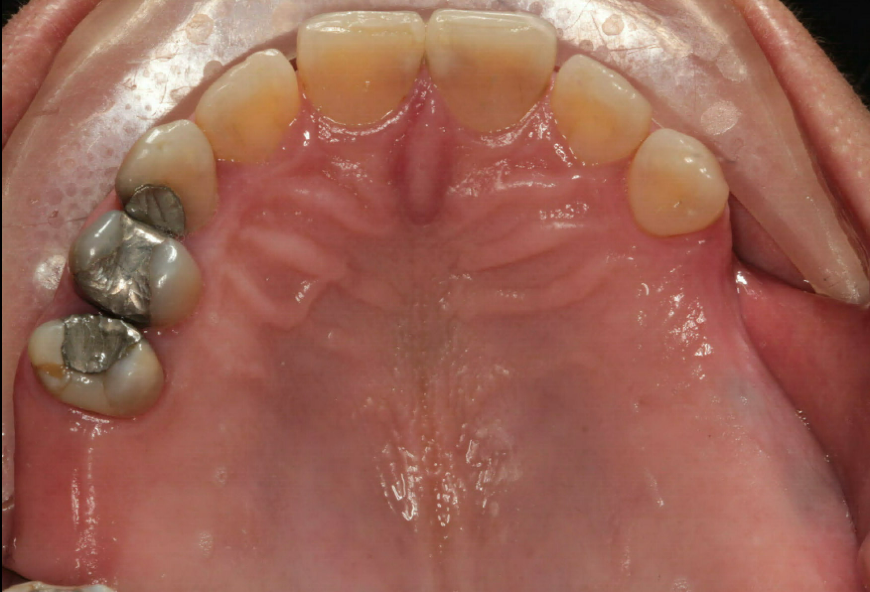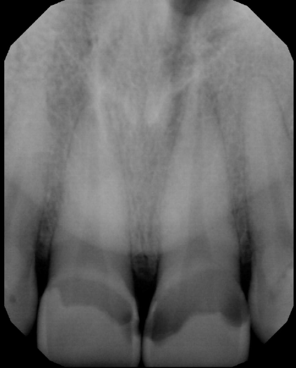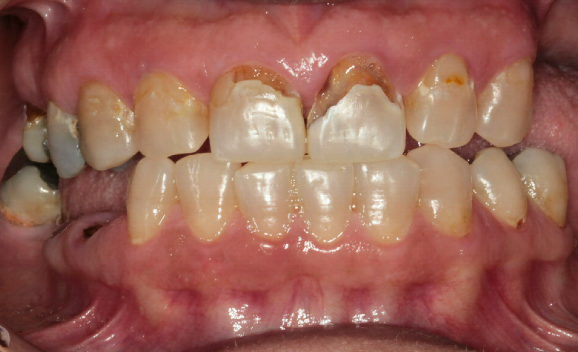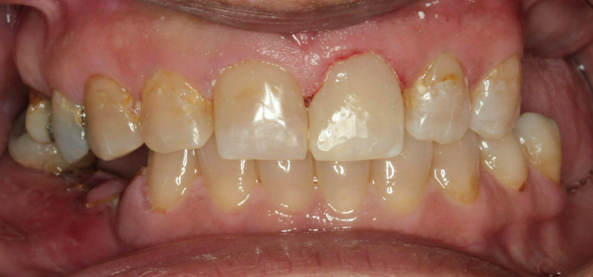 • Reassessment of endo status of teeth 11 and 21 (US # 8 and 9) and need for crowns ➝ cold test reveals that teeth are vital albeit pulp exposure during removal of deep decay. Patient experiences less pain to hot and cold and seems to not need a root canal, Clinical Crown Lengthening (CCL) and crowns on 11 and 21 (US # 8 and 9).