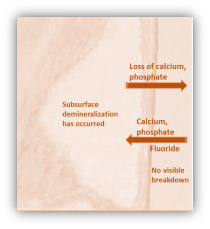 The caries process involves repeated cycles of demineralization and remineralization. Demineralization occurs due to exposure to bacterial acids produced by bacteria metabolizing fermentable carbohydrates. Cariogenic bacteria and fermentable carbohydrates are thus prerequisites for dental caries.22Pitts NB, Zero DT, Marsh PD et al. Dental caries. Nat Rev Dis Primers 2017;25(3):17030. The initiation and progression of dental caries depends on the balance between risk factors and protective factors and occurs when loss of calcium and phosphate from the dental hard tissue (demineralization) outpaces remineralization.6Worthington HV, Khangura S, Seal K et al. Direct composite resin fillings versus amalgam fillings for permanent posterior teeth. Cochrane Database Syst Rev 2021;8(8):CD005620. doi: 10.1002/14651858.CD005620.pub3.,7Demarco FF, Cenci MS, Montagner AF et al. Longevity of composite restorations is definitely not only about materials. Dent Mater 2023;39(1):1-12. doi: 10.1016/j.dental.2022.11.009. Remineralization occurs if conditions are favorable, and in the presence of fluoride is accelerated. Fluoride adsorbs to the partially demineralized surface and attracts calcium ions, which attract phosphate. (Figure 4)