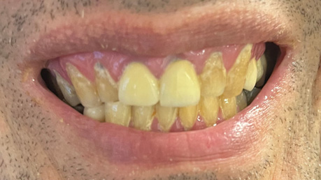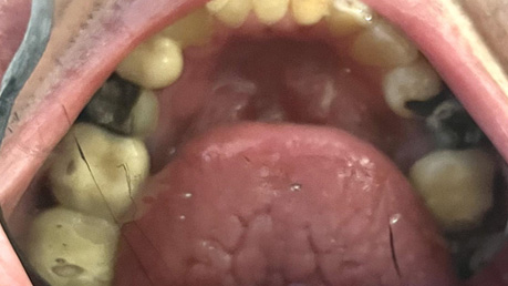 Upon looking intraorally during the first appointment, it was evident that the patient’s at-home hygiene was inadequate. Thus, I demonstrated the Modified Bass method to him using a hand mirror so that he could encourage his PSW to brush his teeth using that method: