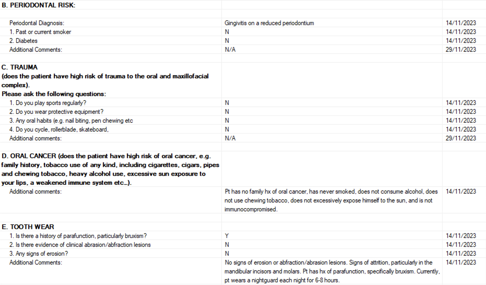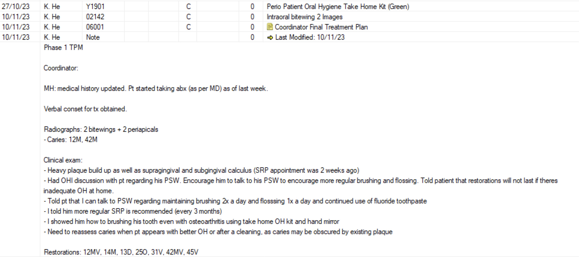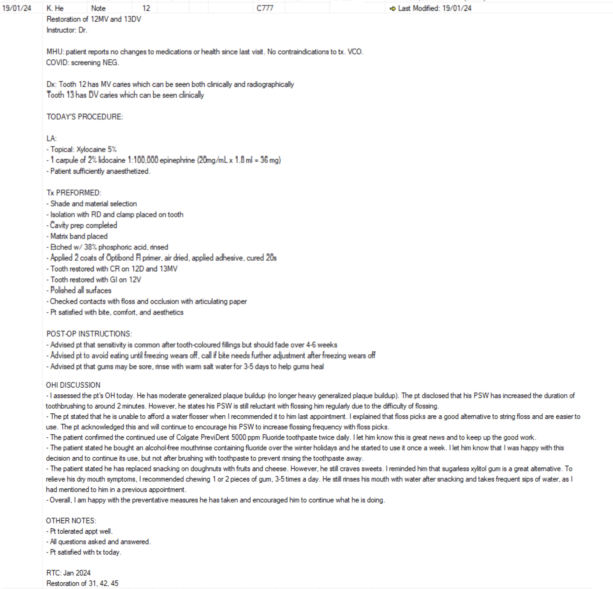 Appointment History: The patient has been a patient at the University of Toronto dental clinic since 2004 and generally sees the dentist once a year. In October 2023, he was transferred to me as his primary student provider.