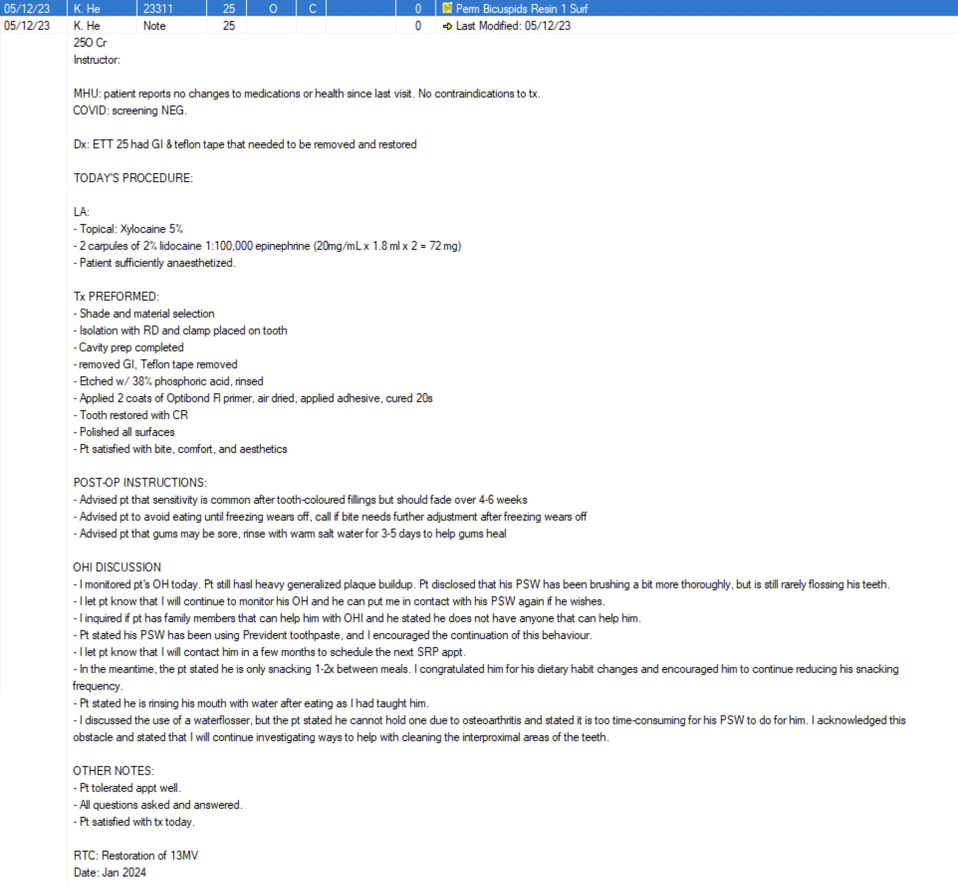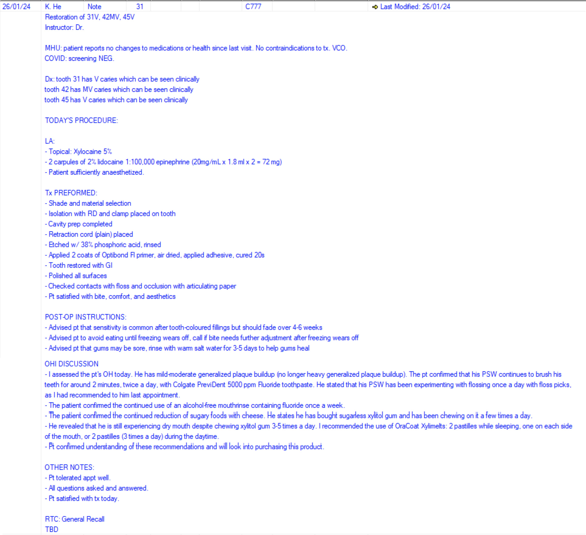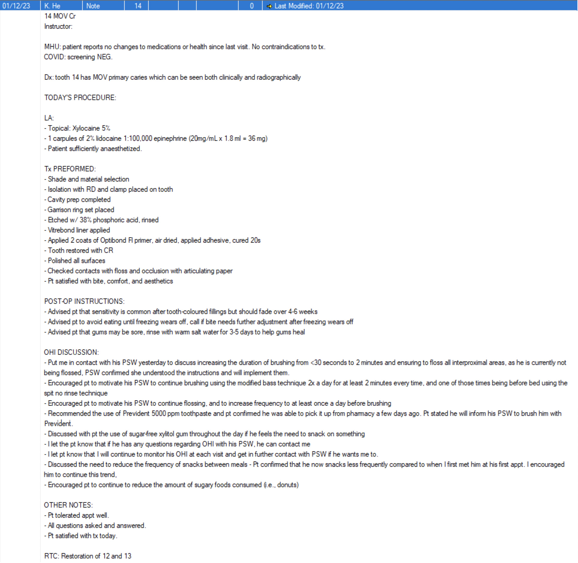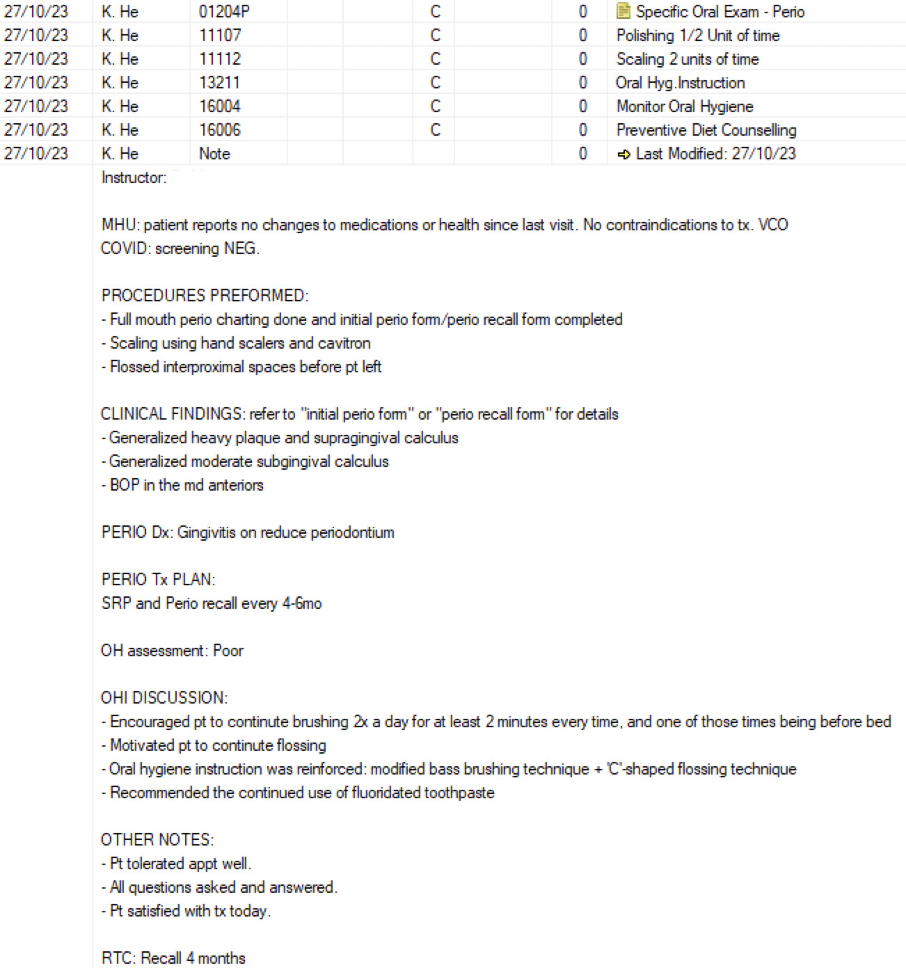 Note: “K. He” is my name. The instructor's name was removed to de-identify them. “C” stands for “Complete”. “MHU” stands for Medical History Update. “VCO” stands for Verbal Consent Obtained. “RTC” stands for Return to Clinic.