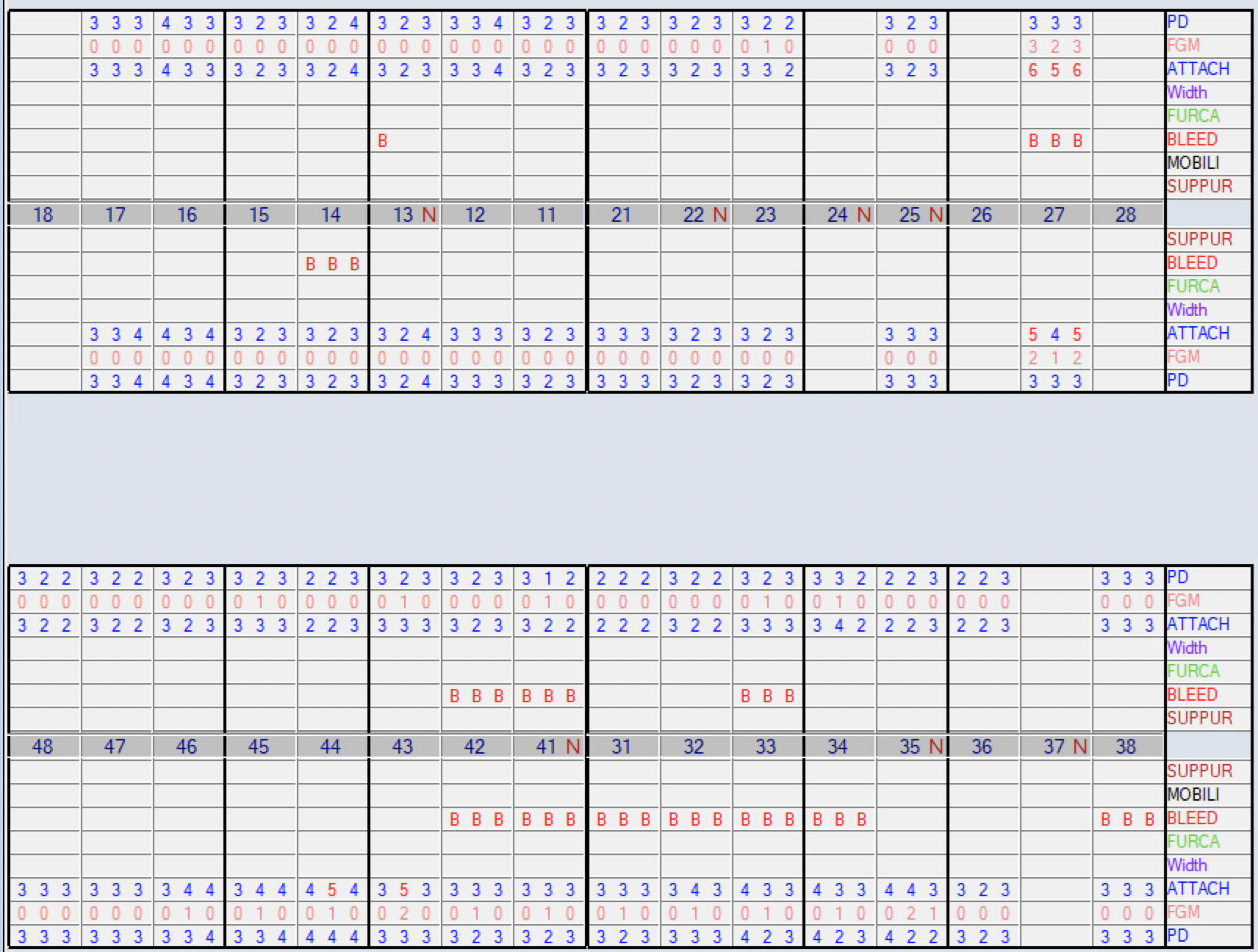 Periodontal condition: Localized BOP in the mandibular anterior teeth. No recession, mobility, furcation, suppuration, or minimal attached width. Pocket depths are generally 2-4 mm, with clinical attachment loss of 5 mm and 6 mm at teeth #27 and #44.