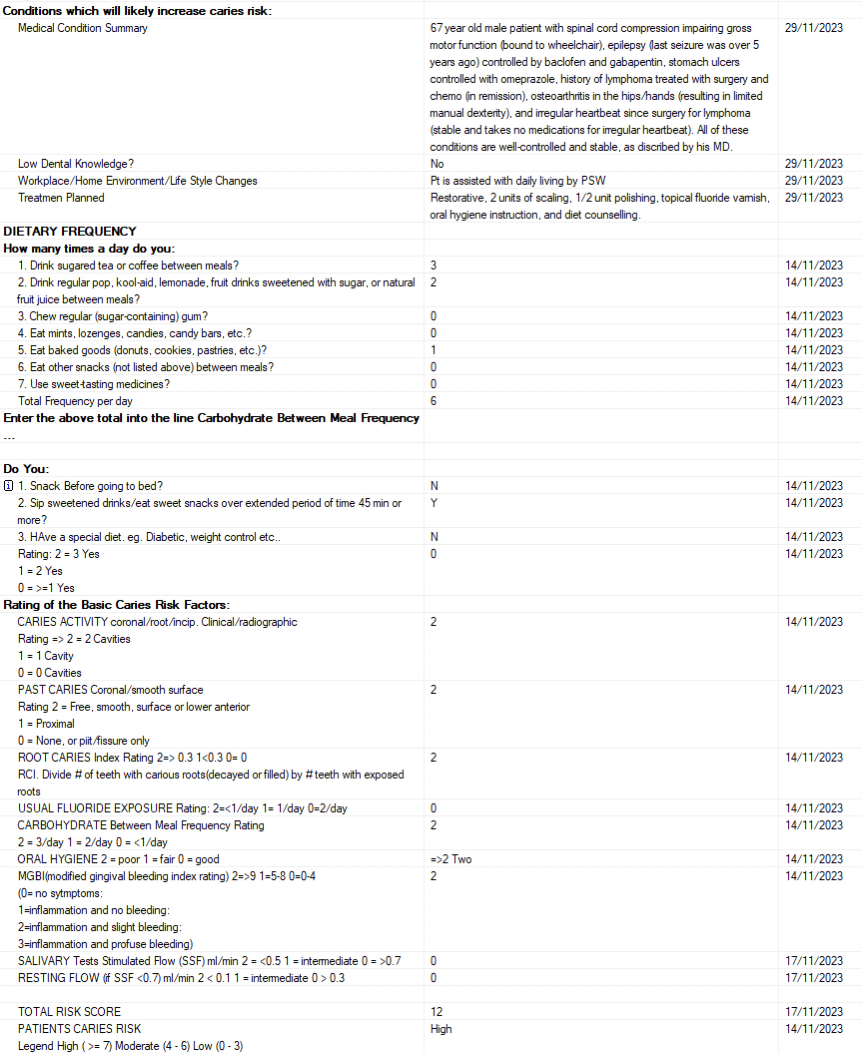 This is the risk assessment used at the University of Toronto Faculty of Dentistry. According to this assessment, the patient is currently at high risk based on his at-home oral hygiene routine, dietary habits, and clinical assessment.