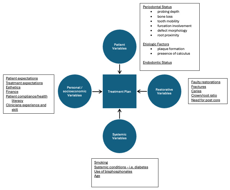 Figure 1. Variables to be considered when deciding upon tooth retention and treatment vs. tooth extraction and implant placement. The variables are grouped into 4 domains. Adapted from Avila et.al. (8).