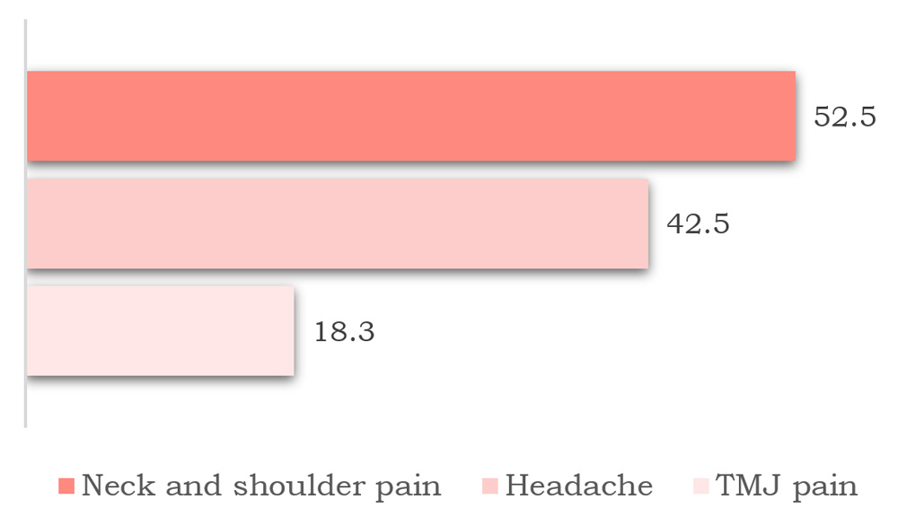 In a recent multicenter cross-sectional study (2024) with several hundred participants, the validated Performance-related Pain among Musicians Questionnaire was used to evaluate TMD.12Zao A, Altenmuller E, Azevedo L. Factors Associated With Performance-Related Pain Among Musicians: A Multicenter Study Using Validated Tools. J Occ Rehabil 2024;25(2):393-406. The lifetime prevalence of performance-related pain was found to be 57.5% and 42.5%, respectively, among professional musicians and music students. In a second study conducted in 2024, both a general questionnaire and a validated TMD Pain Screener test questionnaire were completed by almost 500 individuals.13Z'Graggen S, Ettlin DA, Alessandri1 E et al. Prevalence of Painful Temporomandibular Disorder Symptoms Among Professional and Student Musicians: An Online Survey. I Oral Rehabil 2025;52(1):9-16. Overall, 19.5% of musicians reported painful TMD, with a more than two-fold risk found for upper string players (violin and viola) and an almost three-fold risk of painful TMD found for keyboard players (piano, harpsichord and accordion). In the same year, in an observational cross-sectional study on music students, 72% of participants reported varying degrees of TMD, while for 58% of participants mild TMD was experienced.14Garcez LR, Souza RA, Sales AA, Fernandes ML. Incidence of signs and symptoms of temporomandibular dysfunction in music students: a cross-sectional observational study. J Health Biol Sci 2024;12(1):1-5. In a large survey conducted in 2019 with 1470 respondents, overall, 18.3% of the group evaluated specifically reported TMJ pain while 42.5% and 52.5%, respectively, reported headache, and neck and shoulder pain, highlighting the various structures involved.15van Selms MKA, Wiegers JW, van der Meer HA et al. Temporomandibular disorders, pain in the neck and shoulder area, and headache among musicians. J Oral Rehabil 2019;00:1-11. https ://doi.org/10.1111/joor.12886. (Figure 1)