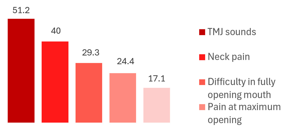 Figure 2. Percentage of violinists experiencing signs and symptoms of TMD23Rodríguez-Lozano FJ, Sáez-Yuguero MR, Bermejo-Fenoll A. Prevalence of temporomandibular disorder-related findings in violinists compared with control subjects. Oral Surg Oral Med Oral Pathol Oral Radiol Endod 2010;109(1):e15-9. doi:10.1016/j.tripleo.2009.08.032.
